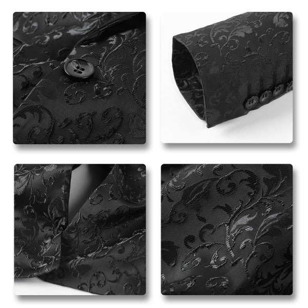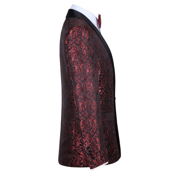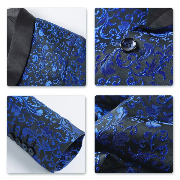This elegant suit blazer with black shawl collar, center vent, one chest pocket, two inner pockets and two side flap pockets, Featuring exquisite floral print, 3D tailored fit cut and full shoulder design, overall nice expressing a sharp looking.
